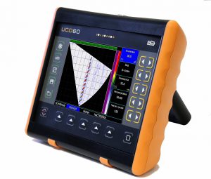 На экране отображается цветное изображение сечения объекта в реальном времени — оператор видит геометрию дефекта, его координаты, высоту, протяженность и амплитуду в процентах от эталонного отражателя.