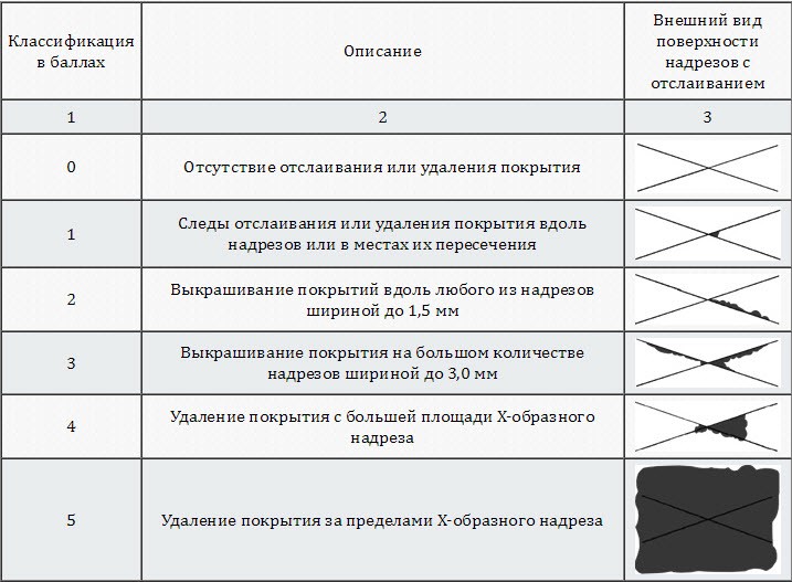 Степень адгезии оценивается оператором визуально по таблице от 0 до 5 баллов.