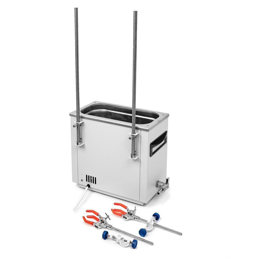 Универсальная баня ЛБ23‑Ш оснащена легко извлекаемой корзиной с подвижным дном для размещения лабораторной посуды различного размера, стальными концентрическими кольцами для ее уплотнения, штативами и лапками с зажимом.