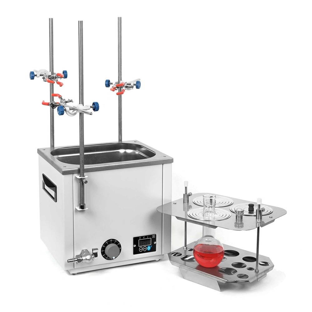 Универсальная баня ЛБ33‑Ш оснащена легко извлекаемой корзиной с подвижным дном для размещения лабораторной посуды различного размера, стальными концентрическими кольцами для ее уплотнения, штативами и лапками с зажимом.
