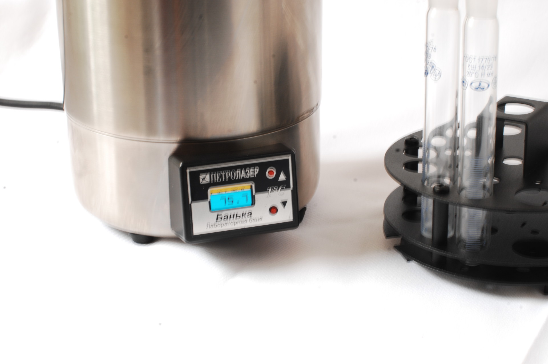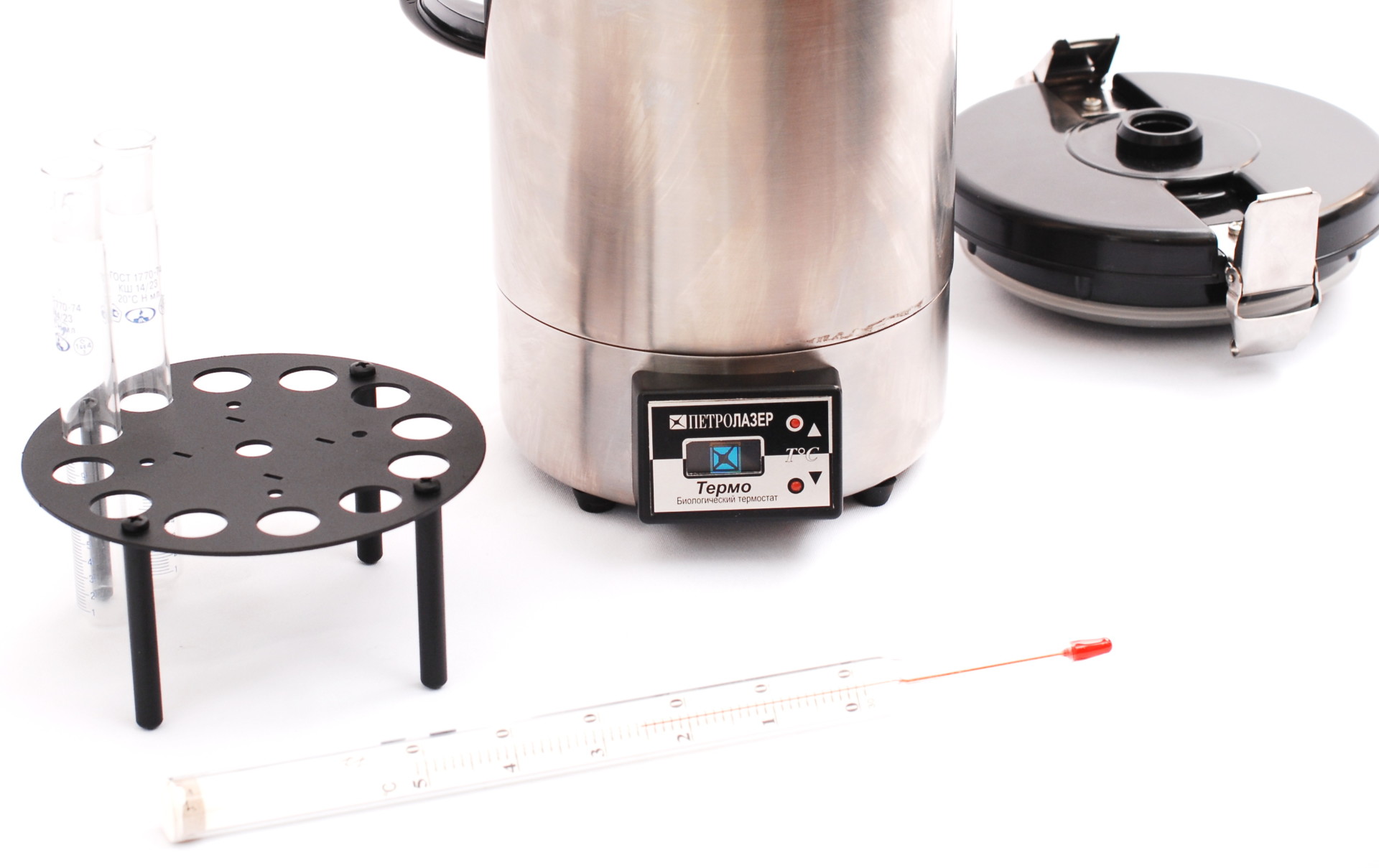 В комплект поставки входит штатив на 10 пробирок или пенициллиновых флаконов и спиртовой термометр. Возможна поставка прибора с новым цифровым контроллером.