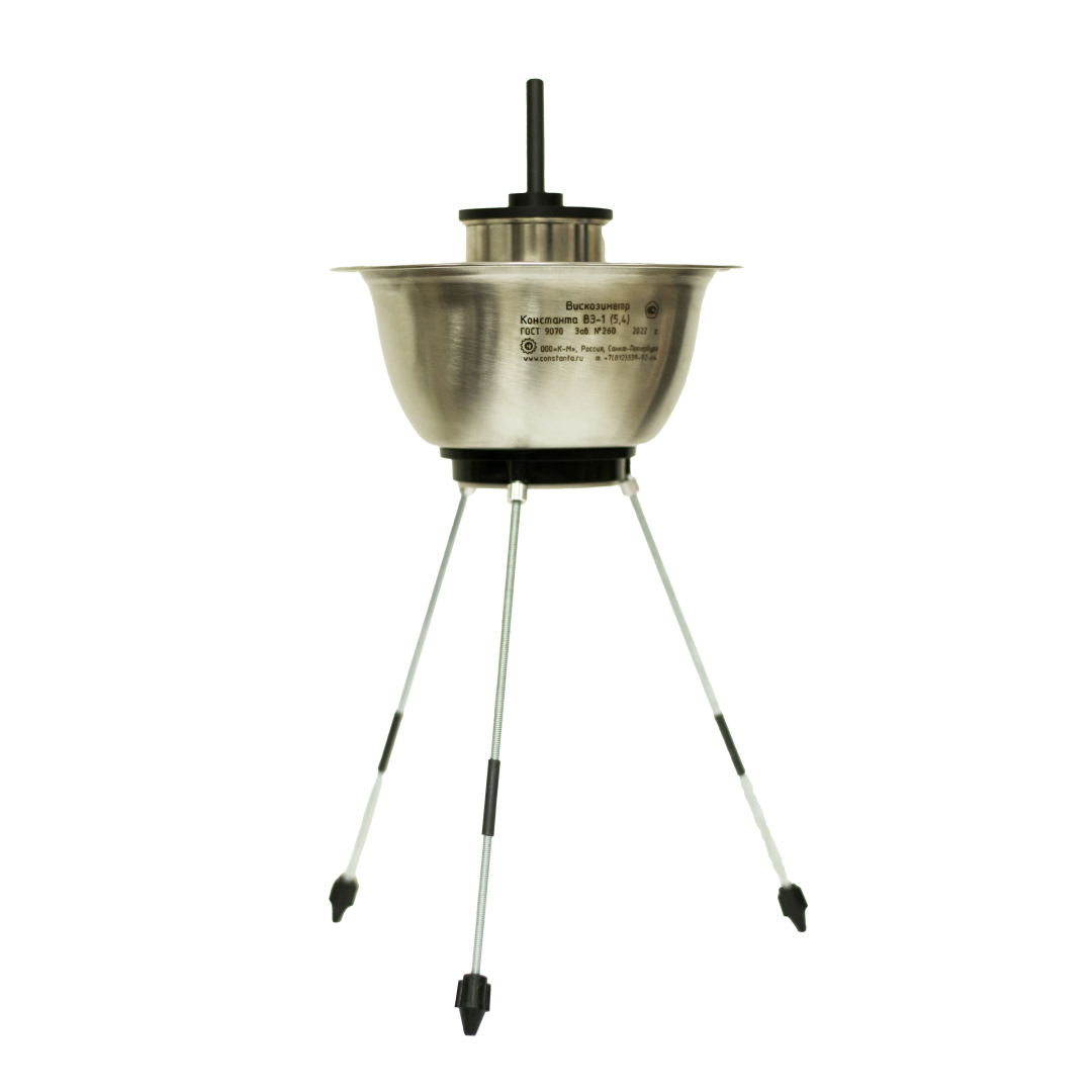 Вискозиметр представляет собой резервуар цилиндрической формы, переходящий внизу в полый конус со съемным соплом. Сопло выполнено из нержавеющей стали. Прибор устанавливается на штативе с регулировочными ножками (тренога).