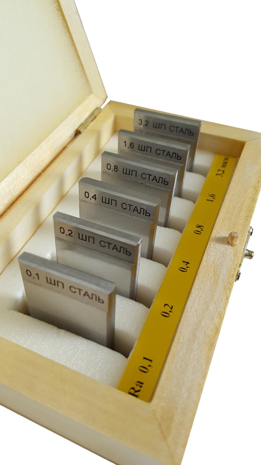 Образцы изготавливаются с различными номинальными значениями параметра шероховатости Ra, выбранными из ряда номинальных значений, допускается дополнительно оценивать поверхность образцов параметрами шероховатости Rz, Rmax, Sm, S и др., значения которых не нормируются и приводятся как справочные по результатам измерений. Также можно заказать комплект из 6 шт, состоящий не из образцов с различными номинальными значениями параметра шероховатости Ra, а комплект только с одним или двумя номинальными значениями параметра шероховатости Ra, например: 0,1; 0,2; 0,3 и далее по выбору заказчика.