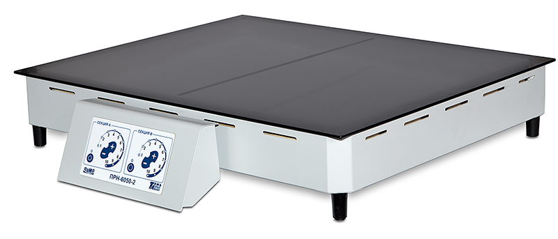 Плита нагревательная лабораторная со стеклокерамической поверхностью и двумя независимыми секциями нагрева. Размер нагревательной поверхности: 600х500 мм. Температура нагрева: до 450 оС. Имеет две модификации: с встроенным и выносным блоком управления.