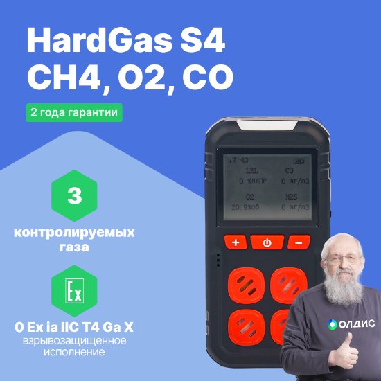 Портативный газоанализатор HardGas S4 (CH4, O2, CO) - это индивидуальный мультигазовый прибор с четырьмя надежными датчиками (сенсорами), предназначенными для автоматического непрерывного измерения концентрации горючих газов (метан, пропан, гексан и других), кислорода и оксида углерода (угарного газа) в воздухе рабочей зоны промышленных объектов (НПЗ, склады ГСМ, нефтебазы, нефте/газопроводы, скважины и т.д.). Газоанализатор имеет 3 вида сигнализации при достижении установленных порогов срабатывания: яркие светодиоды, громкий звуковой сигнал и вибросигнал.