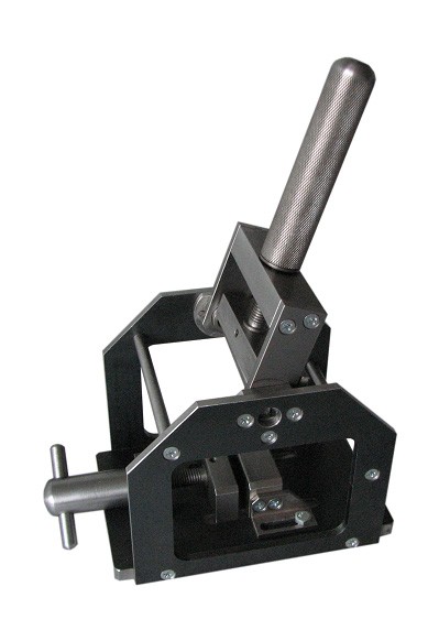 2. С помощью верхней ручки производится плавный изгиб образца вокруг стержня прижимной планкой обеспечивая нужный зазор.