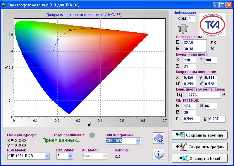 2 Отображение яркости L, кд/м2 и координат цветности (u’, v’) в системе МКО 76