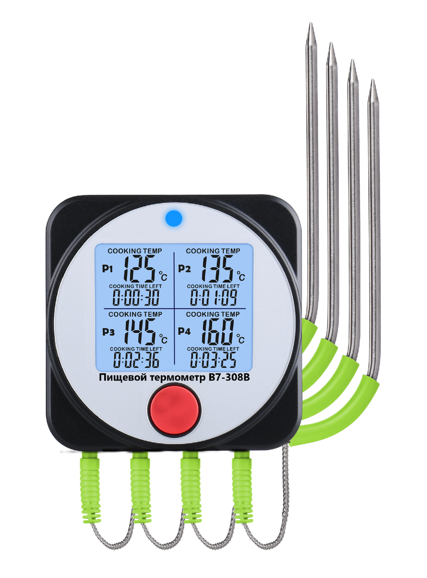 Модель В7-308В – это погружной (проникающий) термометр контактного типа с датчиками выносного исполнения для удалённого контроля температуры при заморозке, охлаждении или горячей прожарки (в печи, духовке, на гриле, в первую очередь барбекю – BBQ) пищевых продуктов. Термометр может быть также использован для контроля процесса изготовления резин и пластмасс.