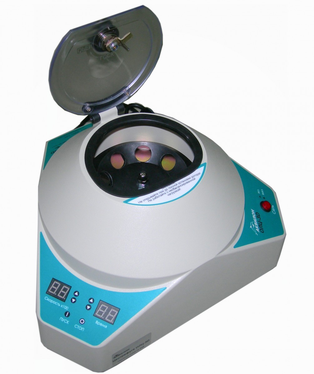 Центрифуга лабораторная для разделения неоднородных жидких систем, в том числе разделения на фракции растворов и суспензий, а также отмывки и микроочистки полученных осадков в поле центробежных сил, частота вращения ротора от 800 до 3300 об/мин.