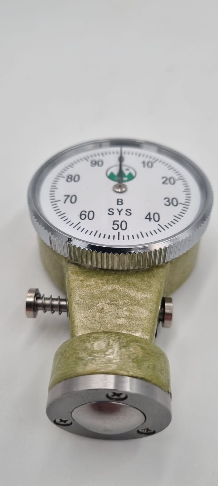 3. Измеритель твердости фиксируется в плоскости датчика. При плотном контакте показание на циферблате останавливается на определенном значении.