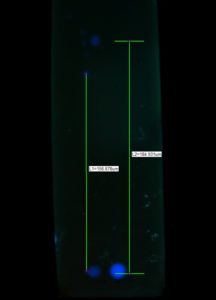 На фото — скрин с экрана компьютера. В камере — стеклянная пластина с сорбентом , визуализация хроматограммы с помощью БФЛ-5-1, при облучении ее с длиной волны 254 нм. Изображение получено с блока документирования БФЛ 5-1 с разрешающей способностью 5 Мп. Поставляется с программой, позволяющей захватывать изображение, сохранять, обрабатывать его. Также программа позволяет измерять размеры и взаимное расстояние между объектами. Например, дистанцию от линии фронта растворителя до пятна, от линии старта , и т.д. Путем несложных вычислений, таким образом,  пользователь получает величины Rf для различных образцов.