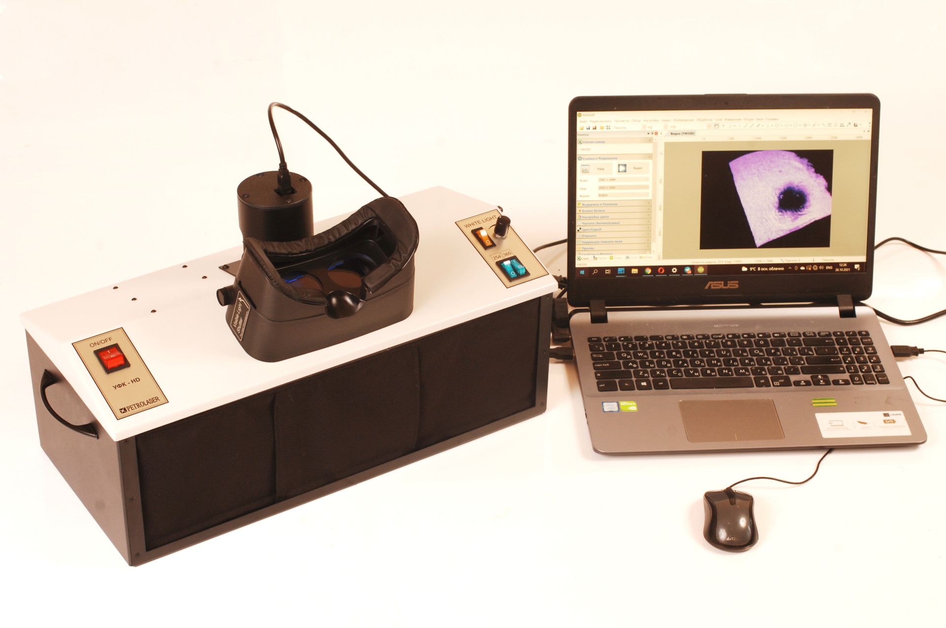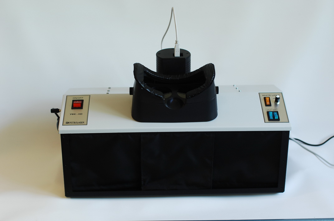 Безопасность зрения лаборанта обеспечивается как используемым защитным УФ-фильтром, который установлен перед окуляром, так и гораздо более редкой необходимостью наблюдать образец визуально: его прекрасно видно на экране дисплея или компьютерного монитора. УФ-осветитель к аналитическому кабинету снабжен специальными светоизлучающими диодами мощностью 20 Вт (365 нм)  + 15 Вт (254 нм) и спектрально-селективными фильтрами (увиолевое стекло). Такая конструкция и оптическая схема позволяют добиться отсутствия мешающего видимого излучения и повысить контрастность и обнаружительную способность при исследовании.